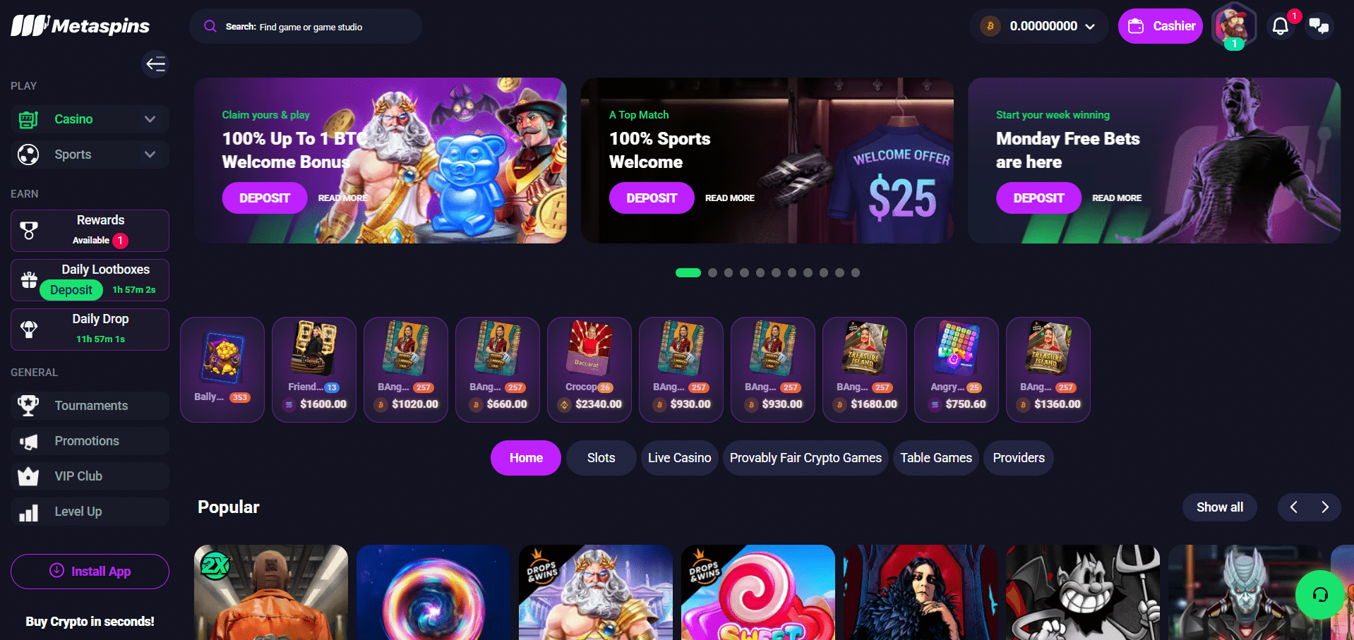 Die Bill’s on US-Promo bezieht sich darauf, dass Metaspins die Auszahlungsgebühren übernimmt. Außerdem hat die Plattform vor kurzem ein neues Angebot eingeführt, bei dem einzahlende Spieler automatisch an einer Verlosung teilnehmen, bei der jeden Mittwoch Krypto-Preise aus einem Pool von 1.000 Dollar ausgeschüttet werden.