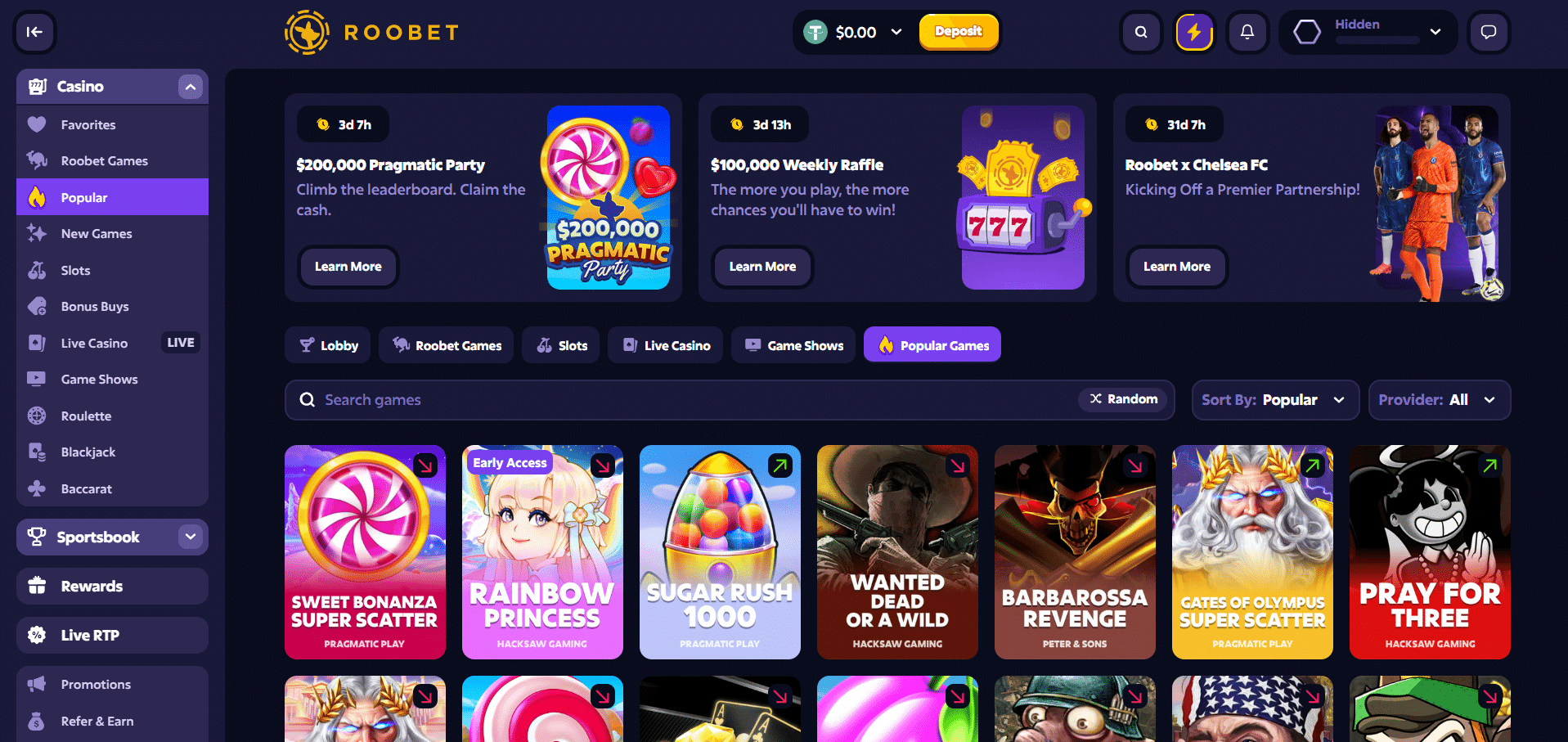 Roobet zeichnet sich durch einen Designstil und eine Organisationsstruktur aus, die man mit der Krypto-Gaming-Sphäre in Verbindung bringt. Die Verwendung von ungesättigten Blautönen mit farbenfrohen, minimalistischen Illustrationen ist angenehm für die Augen und hat in diesem Bereich der Branche ein Zuhause gefunden. Die Navigation ist zufriedenstellend, und du solltest dich schnell zurechtfinden, wenn du schon einmal in einem Online Casino gespielt hast. Oben gibt es eine Schnellzugriffsleiste, darunter liegen ein Suchfeld und ein Pull-Down-Profilmenü.