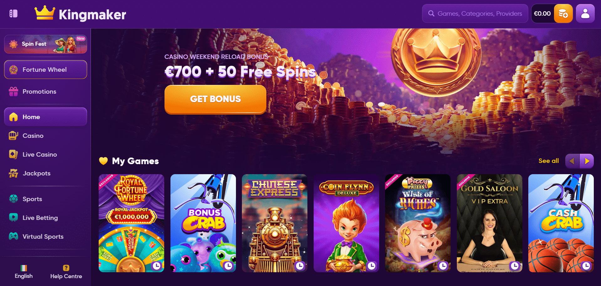 Diríamos que el diseño UX de Kingmaker es aceptable, pero creemos que necesita algún trabajo de redimensionamiento, ya que todo es un poco demasiado grande. Si las cosas estuvieran mejor organizadas, el sitio parecería más moderno. Tiene una navegación sencilla con un menú estándar en el lado izquierdo, pero creemos que esta plataforma tendría un aspecto mucho más acorde con los mejores jugadores del sector, con una mejor elección de colores y una jerarquía visual más racionalizada. Su uso de violetas no es ideal, y no grita una marca premium, por mucho oro que se añada, lo que es un truco un tanto hortera en el panorama actual del juego online.