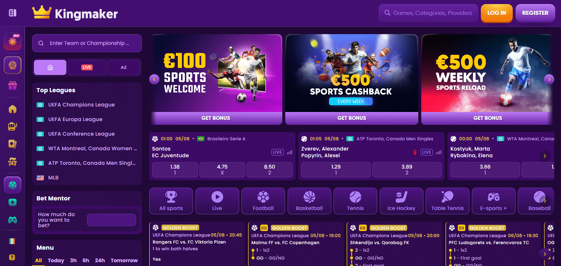 La página de apuestas deportivas de Kingmaker te permite apostar en Fútbol, Tenis, Baloncesto, Tenis de mesa, Hockey sobre hielo, E-sports, Béisbol, Cricket, Voleibol, Balonmano, Fútbol americano, Fútbol sala, Rugby, Carreras de caballos, Galgos, Pádel, Fútbol corto, Bench Valley, Dardos, Snooker, Aussie Rules, Boxeo, MMA, Golf, Squash, Rugby League, Deportes de motor, Deportes acuáticos, Biatlón, Ciclismo, Especiales, Campo a través, Floorball, Salto de esquí, Fútbol gaélico, Hurling gaélico y Lacrosse.