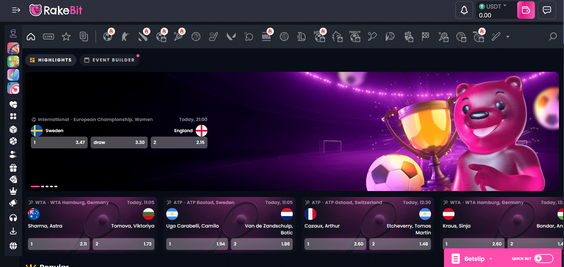 El sitio web de cripto-juegos de azar RakeBit tiene un sportsbook BETBY, que puede ser la mejor opción para la diversión de apuestas deportivas en el sector. Permite apostar en cuarenta y seis tipos de eventos. Se trata de baloncesto, hockey sobre hielo, voleibol, fútbol, FIFA, tenis, FIFA: Volta, eHorse Racing, Handball, eTennis, Table Tennis, eFighting, Kabaddi, Motorcycle Racing, American Football, NBA 2K, Chess, Blitz Basketball, eShooter, eStreetball, Baseball, Boxing, Aussie Rules, eCricket, Rugby, MMA, Futsal, Bádminton, Snooker, Waterpolo, Cricket, Lacrosse, Fórmula 1, Cross-Country, Dardos, Floorball, Golf, Ciclismo, Squash, Esquí alpino, Fútbol playa, Fútbol gaélico, Biatlón, Salto de esquí, Hurling gaélico y Carreras de coches de carreras.