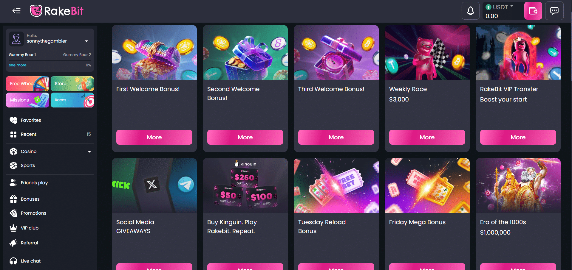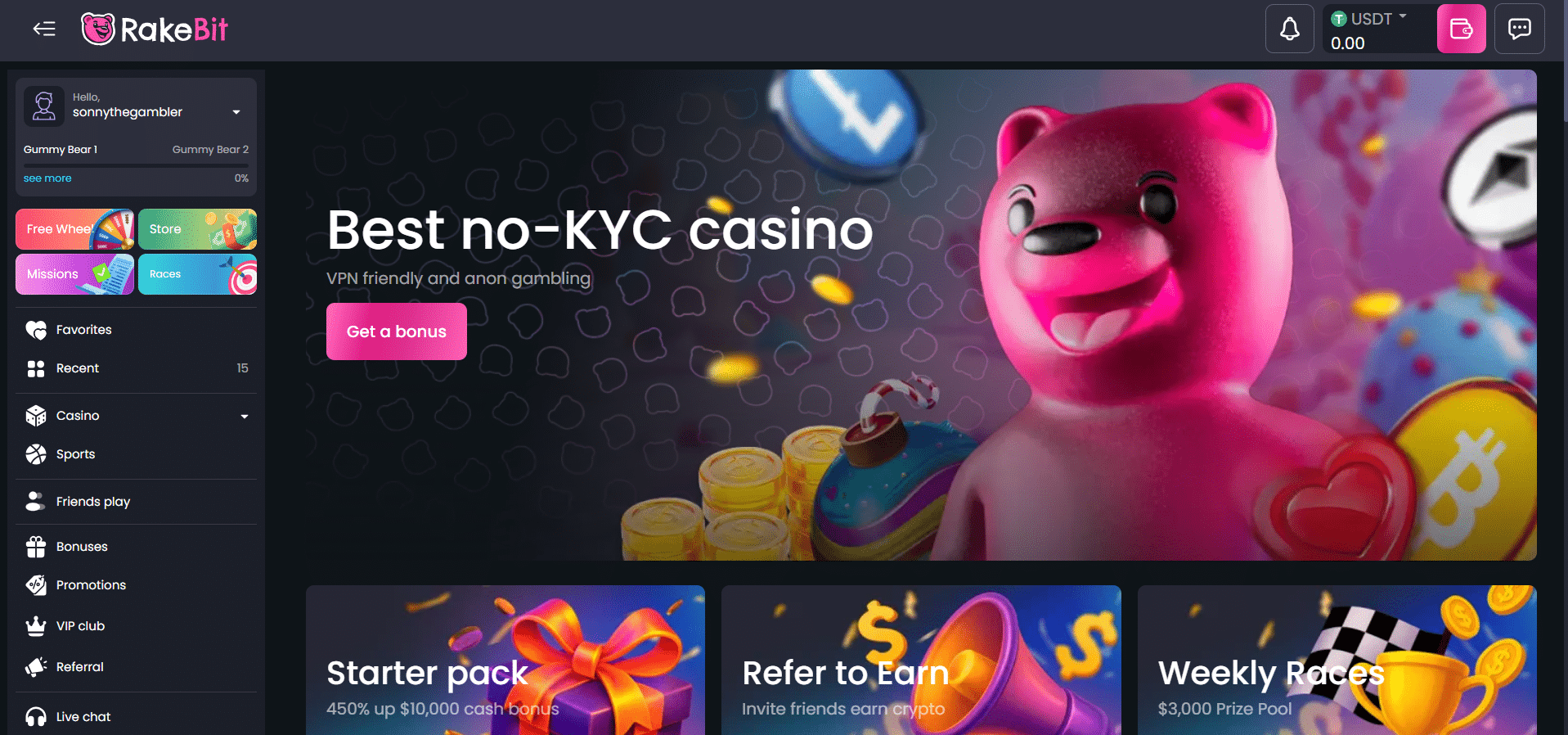 RakeBit tiene un tema de ositos de goma, con rosa y espalda siendo sus colores dominantes, con texto blanco e imágenes coloridas para el contraste, haciendo que el aspecto de este centro sea más dinámico. Usted obtiene la configuración familiar con respecto a la organización, con un menú del lado izquierdo del sitio y una barra de navegación superior con un botón de cartera. La estructura aquí es similar a la que encontrarás en otros casinos online con páginas de apuestas deportivas BETBY.