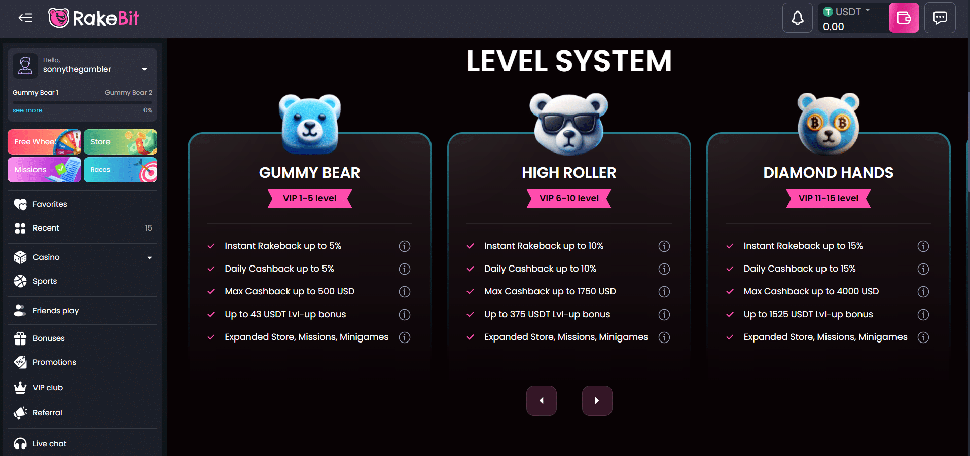 En el rango Gummy Bear, obtendrás un Rakeback de hasta el 5% y un cashback diario del 5% hasta 500 USDT. Estos porcentajes mejoran en un 5% hasta el nivel Rakebit Whale, donde alcanzan un máximo del 25% sin límites y con una bonificación especial por subir de nivel. La bonificación total por subir de nivel puede alcanzar los 40.000 USDT. Se suministra junto con otros beneficios no revelados. Para convertirse en miembro de este club, sólo tiene que hacer depósitos y realizar apuestas. Al hacerlo, conseguirás un gestor VIP personal, límites de apuesta más altos y bonificaciones secretas. Además, tendrás acceso a canales exclusivos como WhatsApp y Telegram para recibir asistencia personalizada.